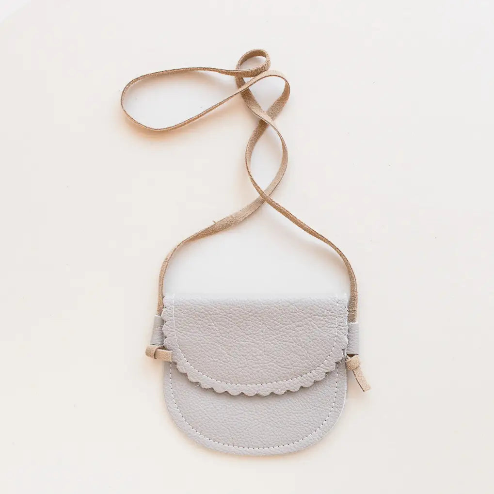 A sweet little bag for little hands! This leather bag has a scalloped edge for the perfect feminine touch. How sweet would this be for a big sister gift? :) No-hardware closure allows for little hands to easily open and close the bag. Bag: 4.75" wide x 4" tall The is sized for 5-7 year-olds. Please supervise children while wearing. Not intended for sleep.